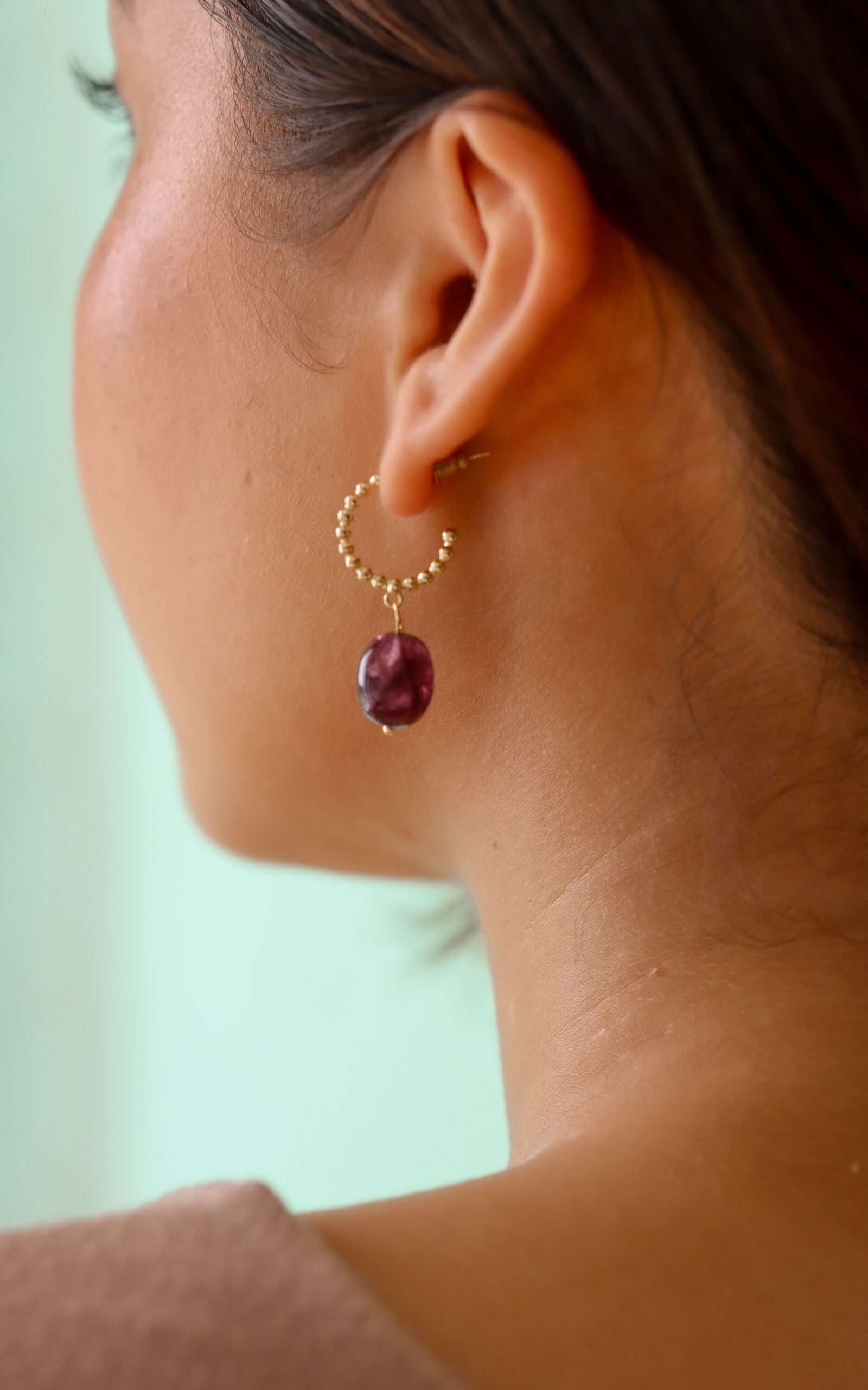 The added sunshine to your look. Natural amethyst semi-precious stone dangling ever-so-gently down a dainty yet distinct beaded half-hoops, it’s the earrings that you want to hold on to forever.