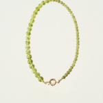 The Sheer Glow Choker is strung with glassy olive-green beads that catch the light in a subtle, Peridot-inspired glow. The design flows with natural rhythm, a gentle contrast between the slightly bolder beads and the more delicate ones, giving the necklace a sense of movement and dimension without overpowering the wearer.